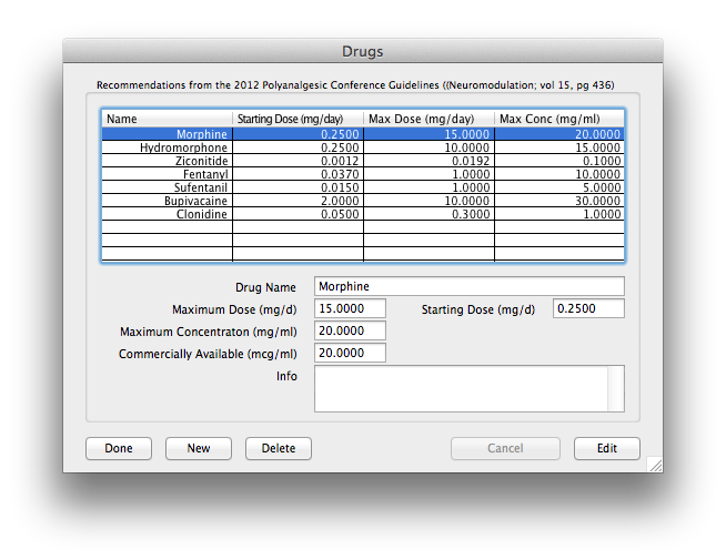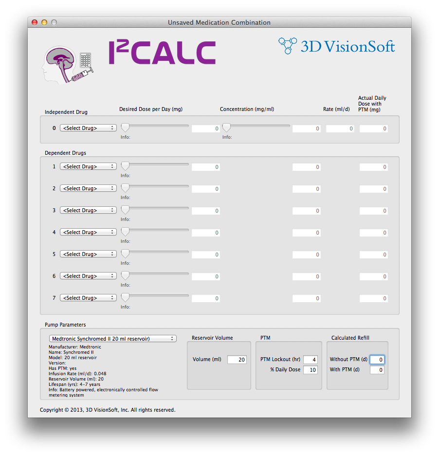 Although other applications exist that can perform basic drug infusion calculations, none serve the pain medicine practitioner treating patients with intrathecal drug therapy. Drug infusion calculations in this specific patient population is particularly challenging because multiple drugs may be infused concurrently at a single infusion rate, therefore individual drug concentrations must be varied to achieve a specific dose delivered for each drug. In addition, the intrathecal drug delivery pump has a finite volume and the infusion rate must be adjusted to achieve an appropriate refill interval. Not only is the refill interval affected by infusion rate, but some intrathecal pumps also allow the patient to self-administer boluses, the volume and frequency of which can be adjusted by the practitioner. These must also be accounted for as they will affect the amount of drug delivered to the patient and consequently how quickly the pump will empty. i2Calc will allow the chronic practitioner to quickly enter and easily adjust all variables for the comprehensive management of intrathecal drug therapy in chronic pain patients.