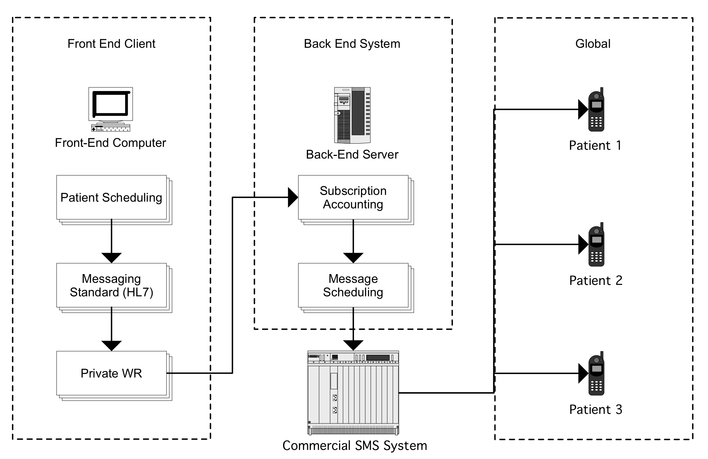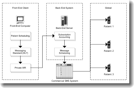 PingerWare is developing PWR™ as an automated patient/client notification system. PWR™ is comprised of a standalone software client application interacting with a commercial SMS server system. PWR™ is used by the office worker who is checking in the patient and enters in basic patient demographics information. Alternatively, PWR™ can receive HL7 standards-based patient demographics data automatically from an HL7 compliant office patient scheduling software. This information is used to create outbound reminder messages that are transmitted to the patient automatically at the proper intervals.