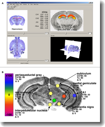 BrainPrint supports digital profiles for comparison of quantitative, spatial and volumetric data from different transgenic mouse models. BrainPrint analyzes all of the experimental data originating from NeuroZoom Pro stored in BrainArchive and identifies those characteristics useful for developing profile information corresponding to certain traits under various phenotypes. Once a brain dataset has been properly described, different genetic conditions may be quickly compared and displayed.