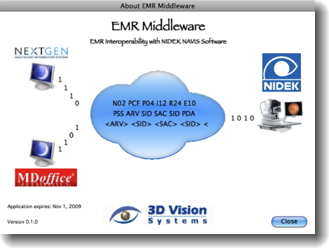 The EMR Middleware acts as a proxy between the hosptal EMR systems that are HL7 compliant in electronic communications and the NIDEK instruments, allowing for basic patient metadata exchange such as during the process of patient registration.
