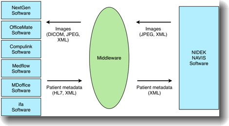 To achieve these goal, a middleware solution was recommended as a proof of concept. The middleware is an application level product that communicates with both NAVIS and the EMR systems. It is responsible for making the intelligent decisions on what instruments to connect to (via NAVIS) and what EMR systems to communicate with. All data (patient demographic metadata as well as images) are transformed and marshalled by the middleware application.