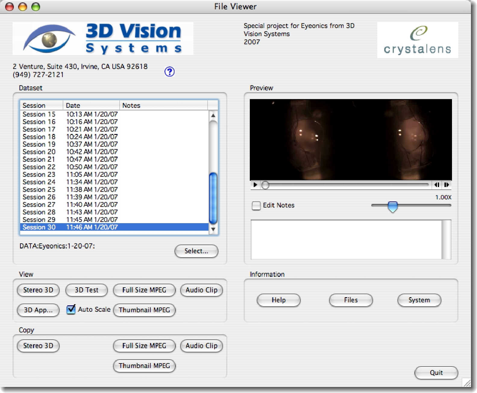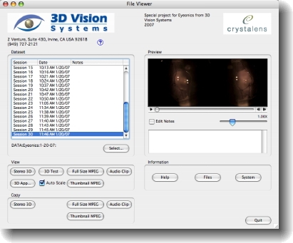 File Viewer is a front end to a complex database of 3D stereoscopic video files. The list of available files, options and thumbnails are displayed. Selected images may be viewed either in a customized stereo 3D program with frame sequential output or in a left/right Quicktime stereo format.